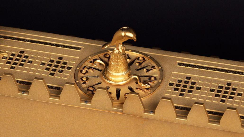 A brass falcon indicates the minutes. It rotates on its own axis on the battlements and stares hungrily at a snake (the minute hand).
