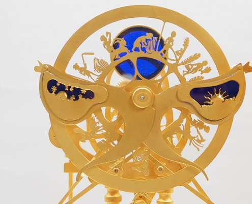 The second object is a time column. At the bottom is a world time display, it moves in 24h once around its axis and switches at midnight the overlying Zodiac display by 1/365. Above this, inside the circular cut-out landscape, which revolves, a cylindrical moon phase is visible. The mechanics of the moon phase must be corrected every 128 years.