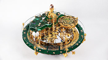 On the ‘The Frog Queen’ table clock, the time is indicated by various changes: every hour, a frog appears. The Frog Queen, hidden within a flower, reveals herself every twelve hours.