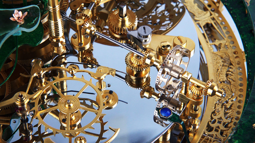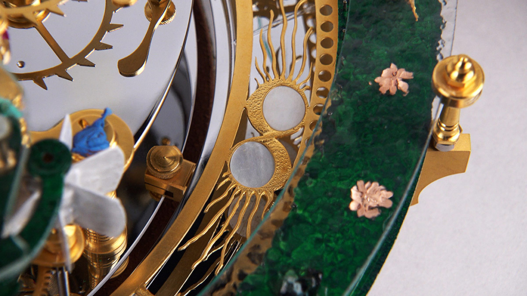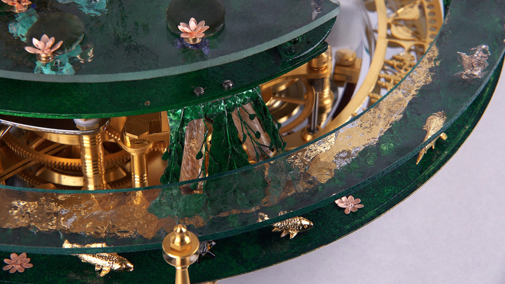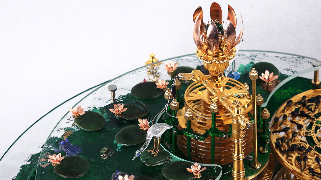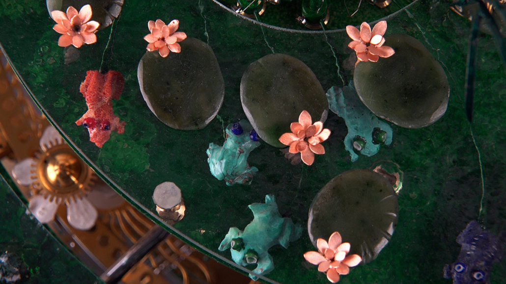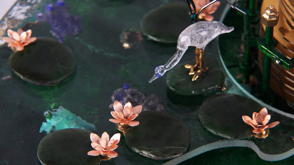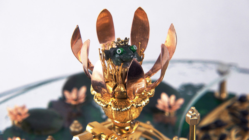 On the ‘The Frog Queen’ table clock, the time is indicated by various changes: every hour, a frog appears. The Frog Queen, hidden within a flower, reveals herself every twelve hours.