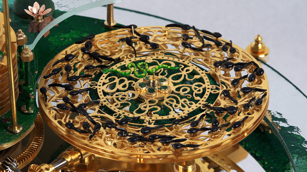 On the hand-skeletted dial, richly decorated with snakes, flowers and tadpoles, a snake indicates the minutes. Each minute is represented by a tadpole.