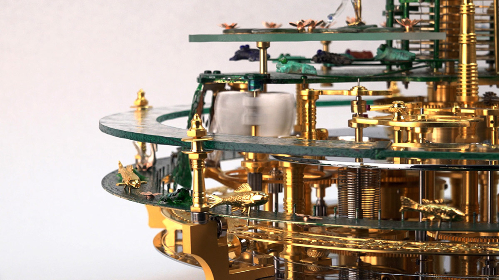 A mechanical automaton enhances the experience in the garden: fish and swans swim past on the outer ring, and water splashes from the upper pond onto the lower level. The automaton is wound by hand and runs for 15 minutes.
