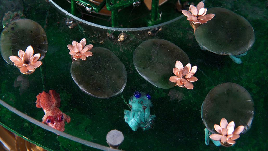 Brass and steel (gold-plated), glass, copper (flower), jade (lotus leaves and frogs), other gemstones such as lapis lazuli, turquoise and dalmatian stone, as well as coral (remaining frogs), cold enamel paint